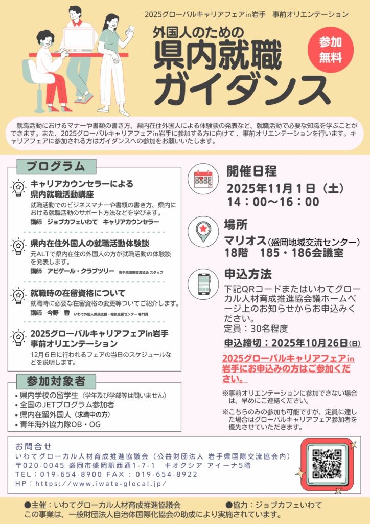 2025グローバルキャリアフェアin岩手に参加する方に向けて、事前オリエンテーションも行いますので、キャリアフェアに参加される方はガイダンスへの参加をお願いいたします。