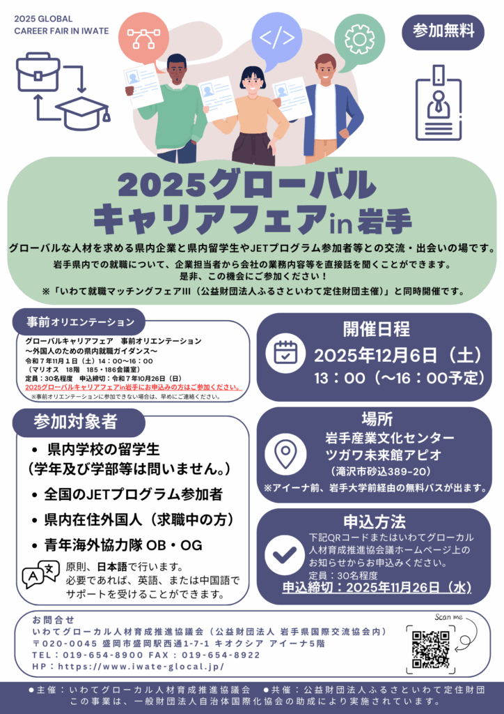 グローバルな人材を求める県内企業と県内留学生やJETプログラム参加者との交流・出会いの場です。是非この機会にご参加ください。