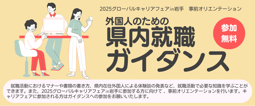 外国人向け県内就職に関するイベントを開催します。 就職活動におけるビジネスマナーや書類の書き方、県内在住外国人による体験談の発表など、就職活動で必要な知識を学ぶことができます。 2025グローバルキャリアフェアin岩手に参加する方に向けて、事前... -